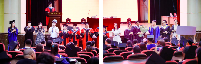 学院党委书记夏跃军、院长李伟、副院长崔喜艳、副院长王法微以及各位研究生导师共同为本硕博毕业生代表拨穗并授予学位。