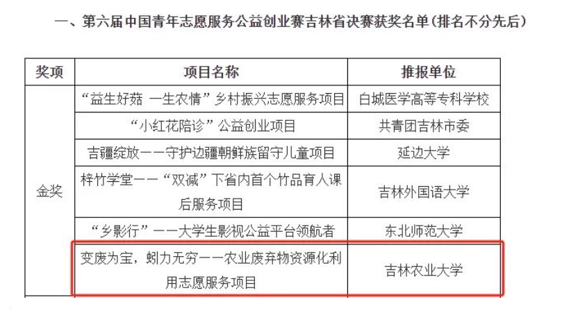 10月10日,第六届中国青年志愿服务公益创业赛吉林省决赛在吉林省青年之家举办。学院参赛项目《变废为宝,蚓力无穷--农业废弃物资源化利用志愿服务项目》荣获吉林省金奖。项目现已被共青团吉林省委推荐参加第六届中国青年志愿服务。
